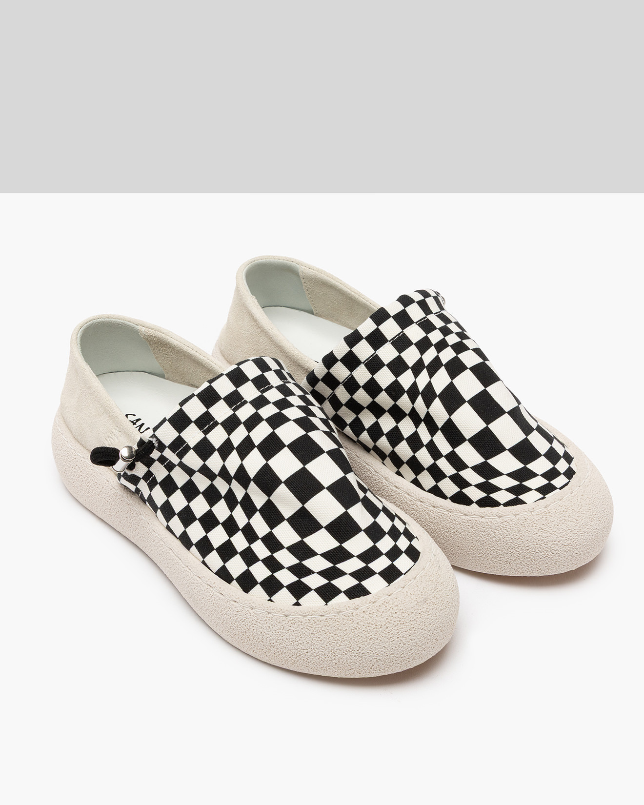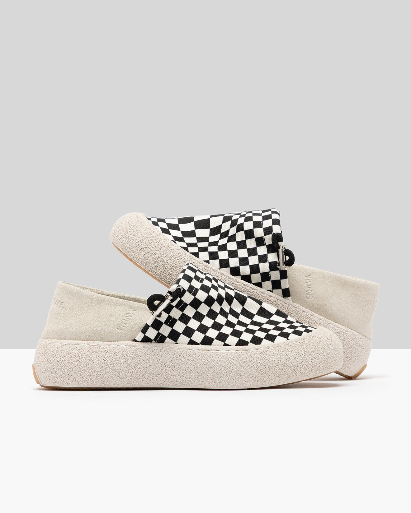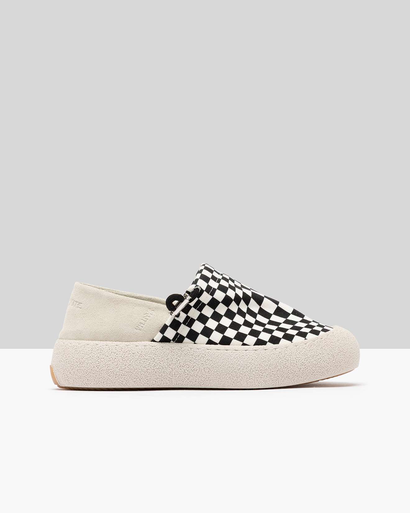 • Upper in suede and checkboard print fabric with adjustable drawstring.